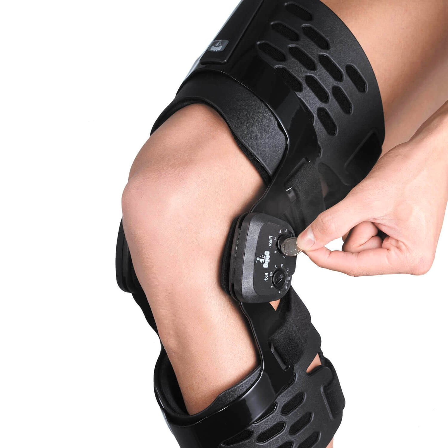 Поверните до упора механизма ручки - это позволяет легко двигать ортез, чтобы точно настроить оптимальное ограничение движения для коленного сустава.