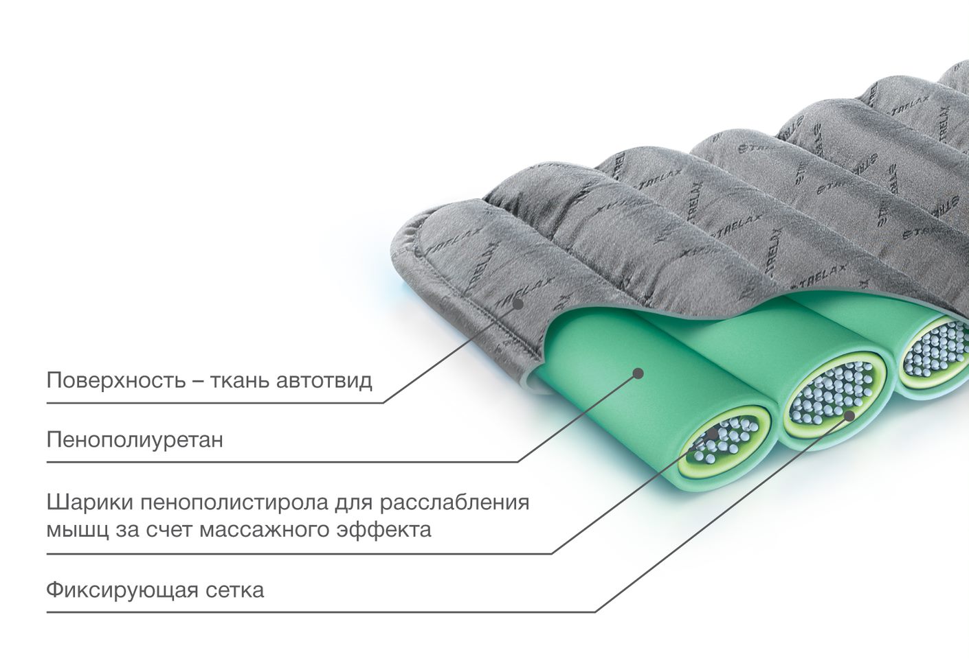 Изделие имеет особенный наполнитель с полимерными шариками, которые отвечают за массажное действие, разгружают мышцы спины и нормализуют их тонус.