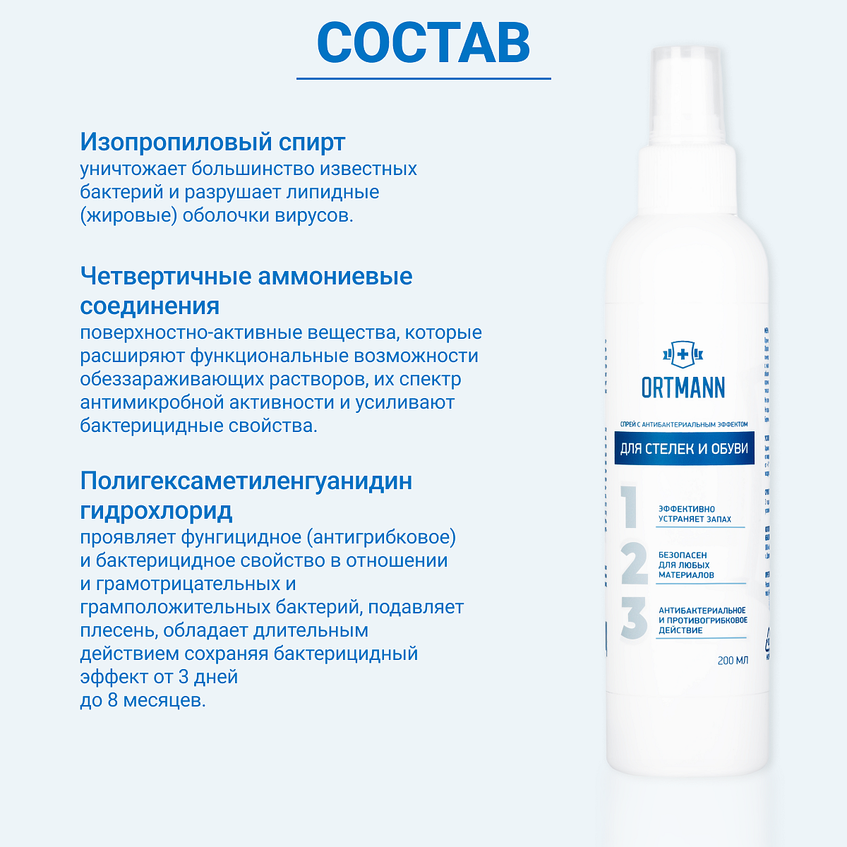 Спрей для стелек и обуви ORTMANN с антибактериальным эффектом – это спрей, оказывающий комбинированное очищающее, антибактериальное и противогрибковое действие.